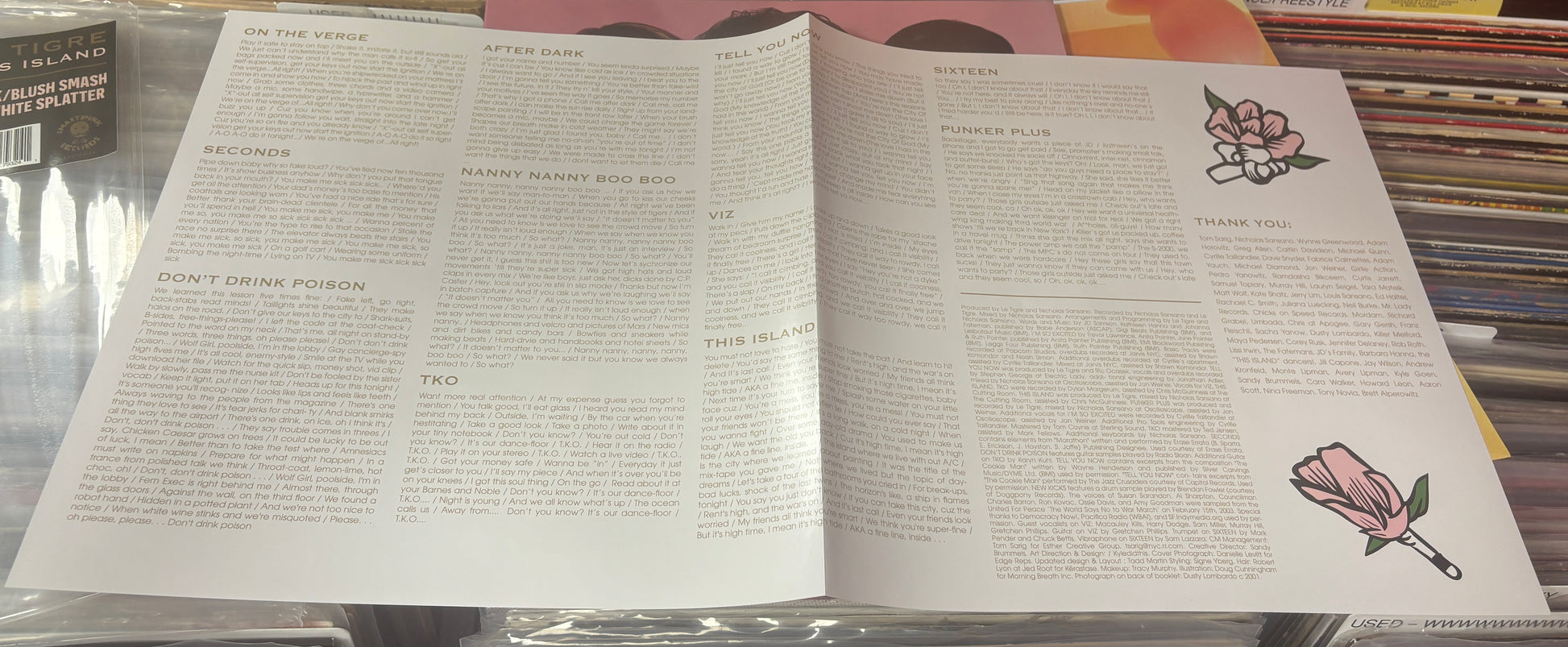 USED: Le Tigre - This Island LP record (black/blush w/ white splatter vinyl)